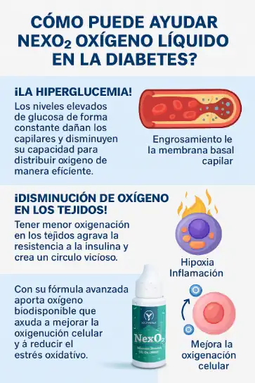 En condiciones como la diabetes tipo 2, las células pierden sensibilidad a la insulina y reduciendo también la disponibilidad de oxígeno. Esto afecta directamente el metabolismo y la regeneración celular. Nexo2 se presenta como una solución complementaria para promover una mayor oxigenación de los tejidos afectados.